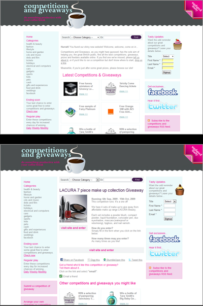 Yey! Finally a spare weekend so I can put together my designs for my new hobby site. I’ve had the domain and PSDs sitting around for months – and now I finally have a working site to show for it. CompetitionsandGiveaways.co.uk lists prizes and freebies up for grabs across the UK.
