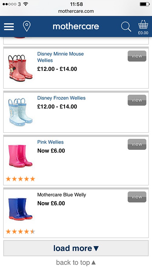 Now, it’s not surprising that all the really cool (cool as in, Thomas the Tank Engine etc. – cool if you’re a baby!), cheap wellies were out of stock. That’s just how life goes. But there were quite a few times I clicked on a listing from the search results, just to wait for a product page to load (on my phone) and be told that the item was out of stock. So then it’s a case of clicking back to the search results and starting over.